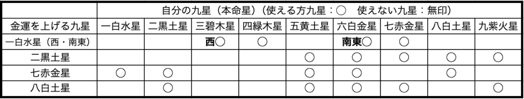 (一白水星(西・南東)の場合、三碧は西のみ、六白は南東が使えます)